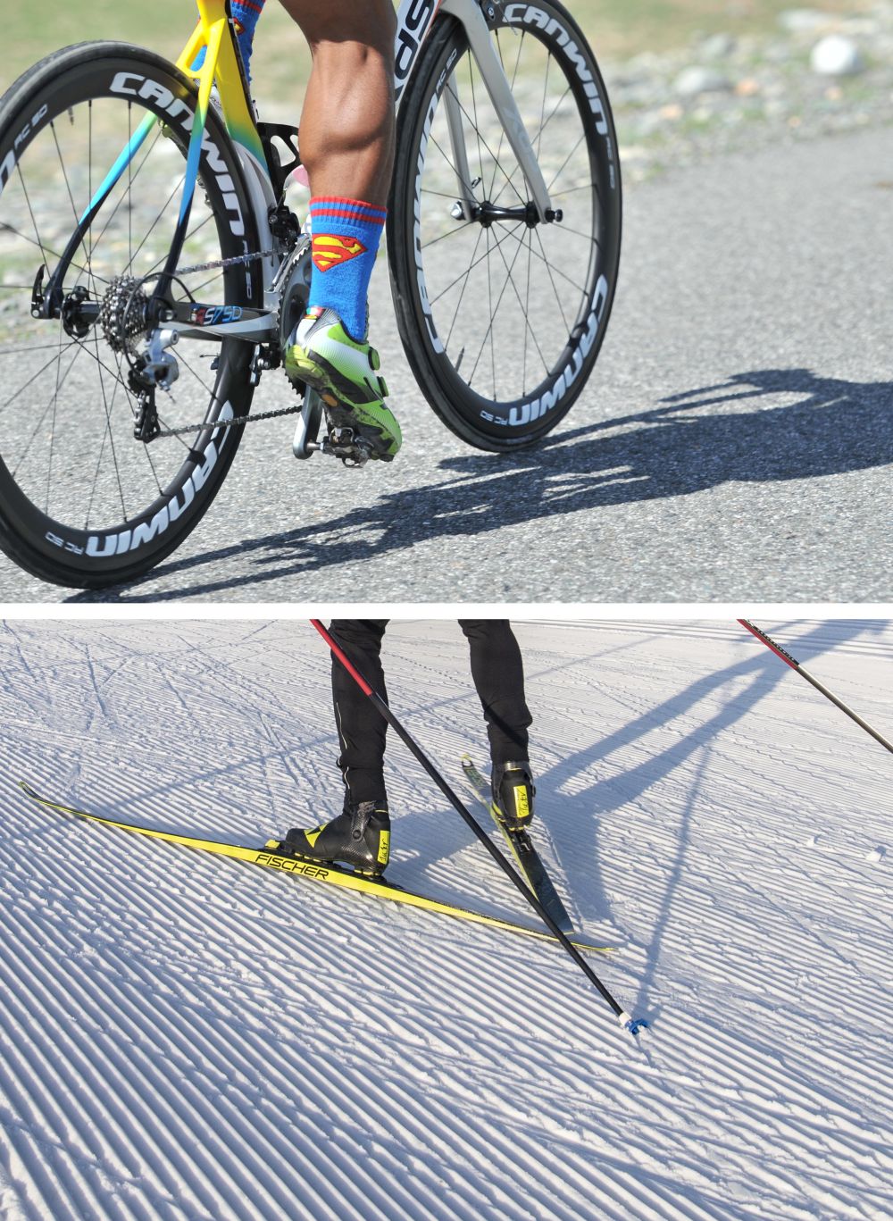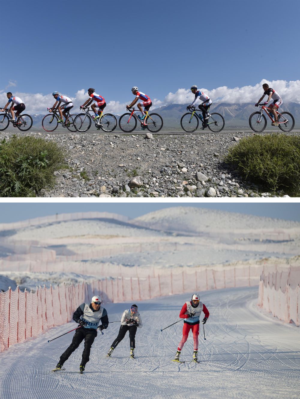 ↑拼版照片:上圖為第十一屆環賽里木湖公路自行車賽前,吐爾松江·布爾力克在温泉縣的一處鄉村公路上練習(2017年5月29日攝);下圖為吐爾松江·布爾力克隨越野滑雪國家集訓隊在新疆温泉縣越野滑雪場訓練(2021年11月25日攝)。