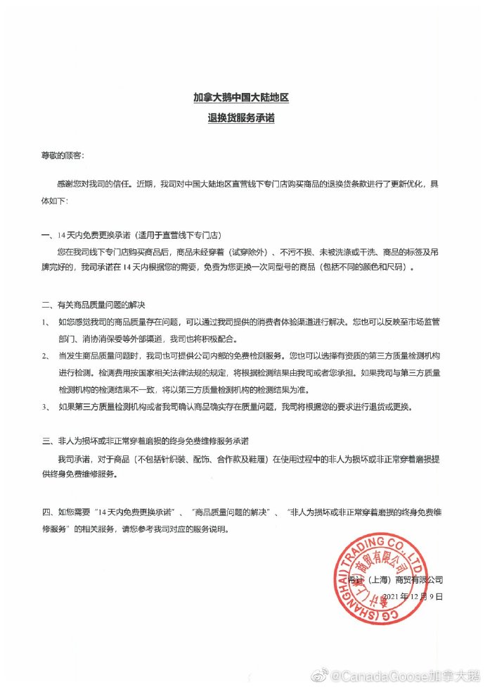 中新經緯12月9日電 9日晚,加拿大鵝官方微博再次發佈聲明稱,在上海市消保委的指導幫助下,公司更新並優化了“加拿大鵝中國大陸地區退換貨服務承諾”。此外,公司也將繼續與上海市消保委合作,在中國法律法規框架下,結合行業實踐,探索提升消費者滿意度的更多途徑。