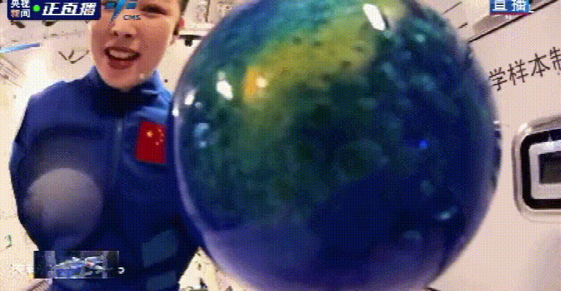 陳徵介紹,在地面環境中,將泡騰片扔進水球裏,就能看到氣泡上浮,可在中國空間站的失重環境中,因為浮力的消失,泡騰片扔進水中的產生的氣泡不再上浮,而是相互擠壓,最後就會形成一個很有意思的樣子,這個水球也會被氣泡撐得更大,就能看到水球一點點膨脹的效果。