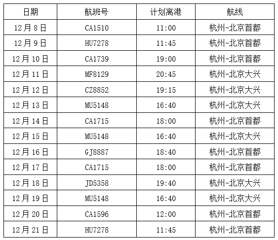 根據民航局疫情防控相關規定,12月8日-21日,杭州機場每日保留一班去北京的航班,且每班客座率不超過75%。杭州機場經與航空公司會商決定,管控期間的每日進京航班安排如下: