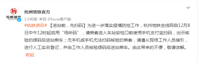 據杭州地鐵集團通報,為進一步落實疫情防控工作,杭州地鐵全線網自12月8日中午12時起啓用“場所碼”,請乘客進入車站安檢口前使用手機支付寶掃碼,出示核驗的綠碼後進站乘車;無手機或手機無法掃碼核驗的乘客,請遵從現場工作人員指引,進行人工實名登記,並由工作人員核驗綠碼後進站乘車。