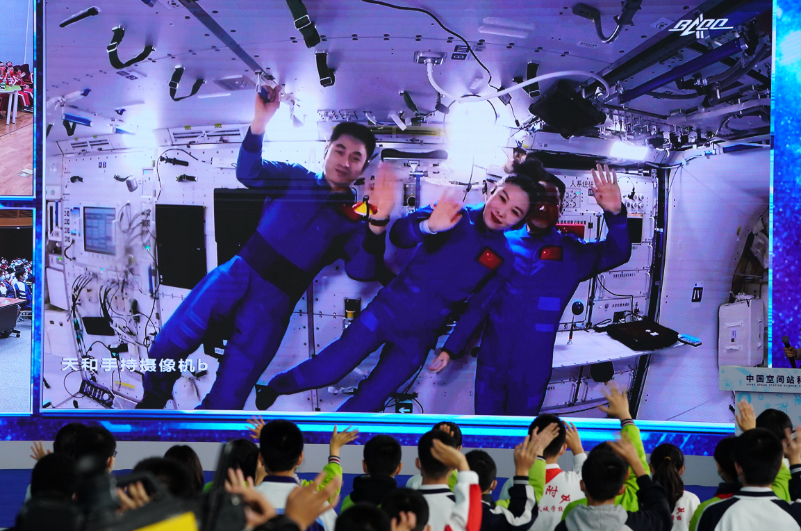 【環球時報-環球網報道 記者 樊巍】12月9日,中國空間站階段的首次太空授課以天地互動的方式,在中國空間站和設在中國科技館的地面主課堂,以及設在廣西南寧、四川汶川、香港、澳門的地面分課堂同步進行。神舟十三號乘組三名航天員翟志剛、王亞平、葉光富演示了失重環境下細胞學實驗、人體運動、液體表面張力等現象,共進行了8項太空授課項目。