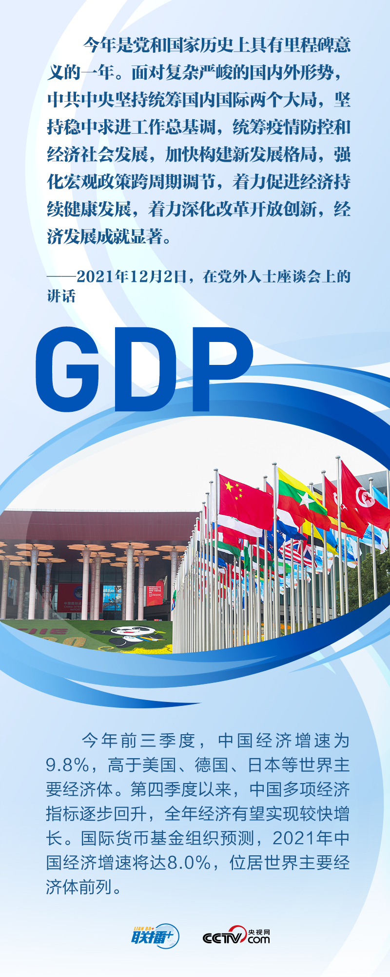 “今年是黨和國家歷史上具有里程碑意義的一年。面對複雜嚴峻的國內外形勢,中共中央堅持統籌國內國際兩個大局,堅持穩中求進工作總基調,統籌疫情防控和經濟社會發展,加快構建新發展格局,強化宏觀政策跨週期調節,着力促進經濟持續健康發展,着力深化改革開放創新,經濟發展成就顯著。”在黨外人士座談會上,習近平總書記充分肯定2021年中國經濟發展取得的成績。