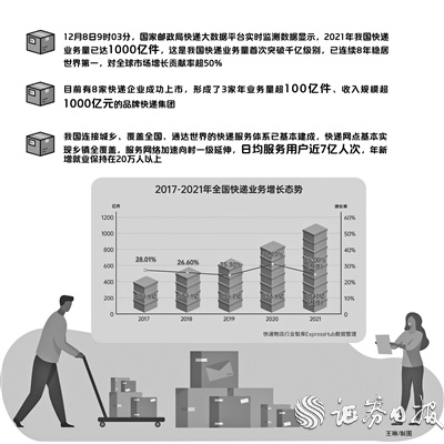 12月8日9時03分,國家郵政局快遞大數據平台即時監測數據顯示,2021年我國快遞業務量已達1000億件,這是我國快遞業務量首次突破千億級別,已連續8年穩居世界第一,對全球市場增長貢獻率超50%。