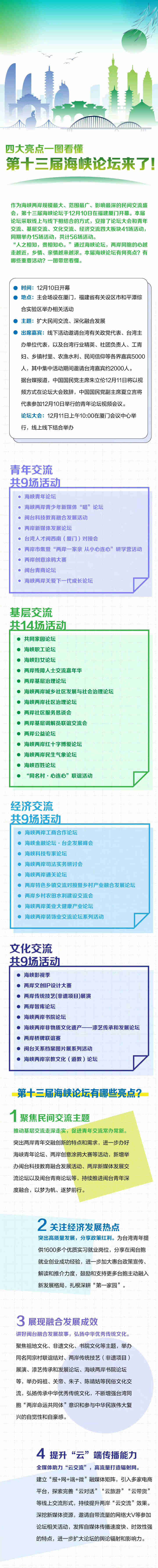 作為海峽兩岸規模最大、範圍最廣、影響最深的民間交流盛會,第十三屆海峽論壇於今日(12月10日)在福建廈門開幕。本屆海峽論壇採取線上與線下相結合的方式,安排了論壇大會和青年交流、基層交流、文化交流、經濟交流四大板塊41場活動。本屆海峽論壇有何亮點?有哪些重要活動?一圖帶您看懂。