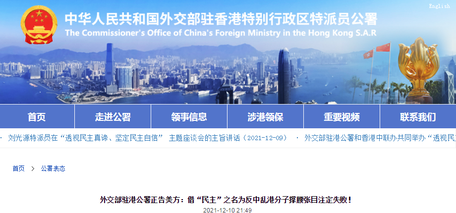 外交部駐港公署正告美方:借“民主”之名為反中亂港分子撐腰張目註定失敗!