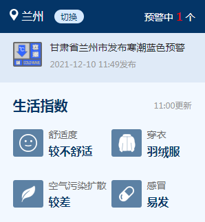 預計48小時內,三縣、蘭州新區及紅古等地最低氣温將下降10℃以上,市區其餘地方最低氣温降幅8-10℃,且最低氣温在4℃以下,將出現寒潮天氣。
