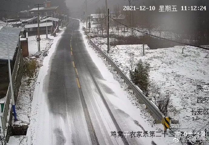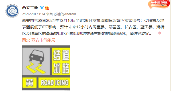 西安市氣象台2021年12月10日11時26分發佈道路結冰黃色預警信號:受降雪及地表温度低於0℃影響,預計未來12小時內周至縣、鄠邑區、長安區、藍田縣、灞橋區及臨潼區的高海拔山區可能出現對交通有影響的道路結冰 ,請注意防範。