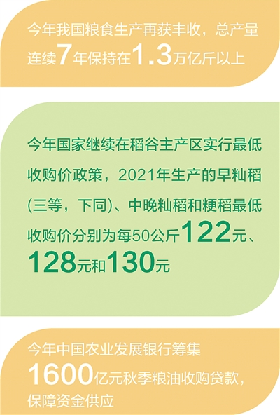 保障收購資金充足。“我們結合全省糧食產量,今年安排800億元信貸資金支持秋糧收購,其中政策性收購資金500億元、市場化收購資金300億元,全力保證資金供應。”中國農業發展銀行黑龍江分行有關負責人介紹。從全國看,今年10月1日至11月21日,中國農業發展銀行累計投放秋季糧棉油收購貸款921.3億元。其中糧油收購貸款投放439.18億元,佔整個收購季糧油收購貸款投放計劃的27%。