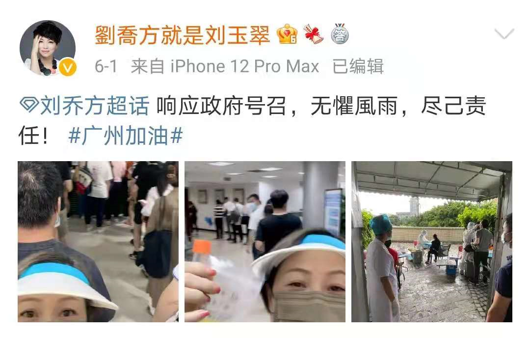 在廣州疫情期間,劉玉翠還拍攝聲援廣州的視頻,分享了自己在廣州接種疫苗的微博,積極響應政府號召,為這座城市注入暖心的力量。
