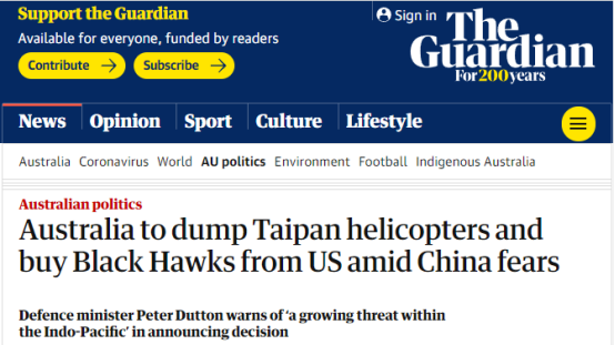 外媒:澳軍方擬放棄歐洲直升機改用美國貨,防長又扯上所謂“中國威脅”