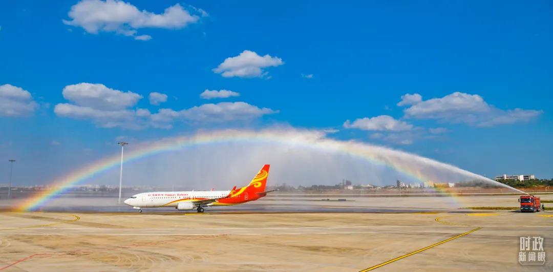 △2021年12月2日,海口美蘭國際機場二期正式投運。這是首個抵達機場二期的航班通過水門。(圖/視覺中國)