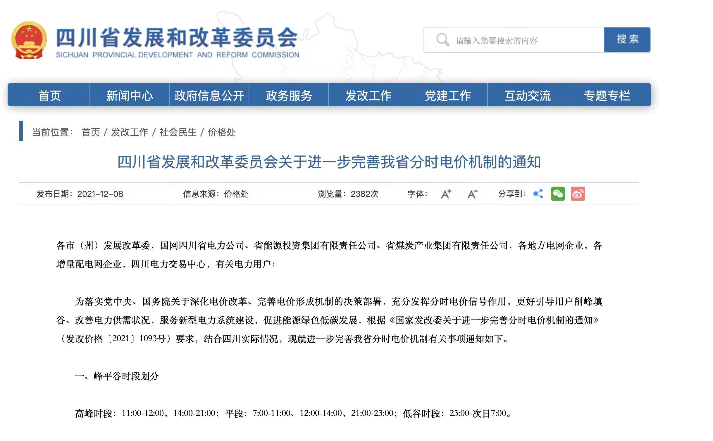 四川省發改委近日印發《關於進一步完善我省分時電價機制的通知》(以下簡稱《通知》),進一步明確了全省分時電價的執行範圍、方式、浮動比例以及建立尖峯電價機制。該通知自2022年1月1日起執行。