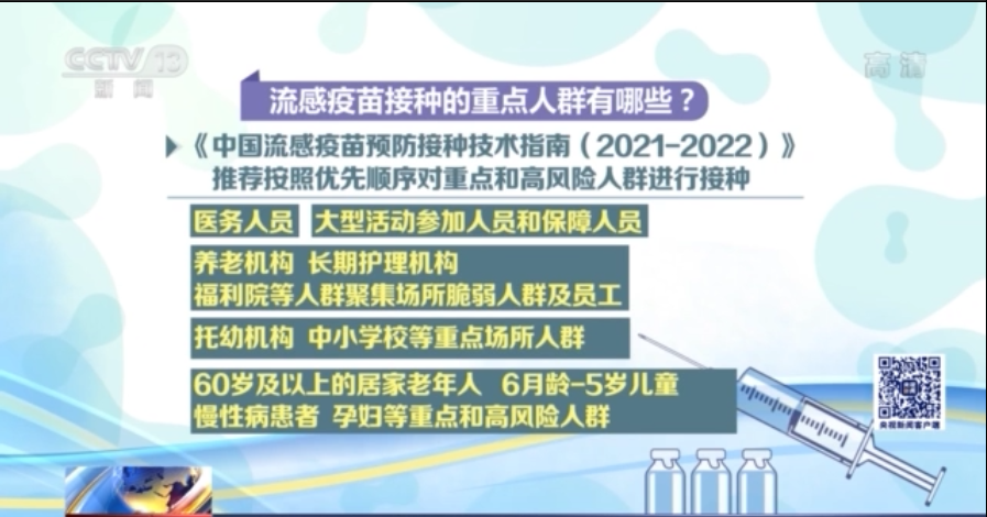 《中國流感疫苗預防接種技術指南(2021-2022)》推薦按照優先順序對重點和高風險人羣進行接種,包括:醫務人員,大型活動參加人員和保障人員,養老機構、長期護理機構、福利院等人羣聚集場所脆弱人羣及員工,托幼機構、中小學校等重點場所人羣以及60歲及以上的居家老年人、6月齡至5歲兒童、慢性病患者、孕婦等重點和高風險人羣開展接種。