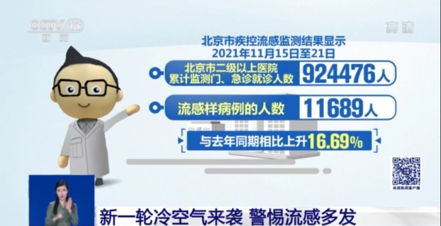 來看一組北京市的數字。上個月,伴隨着多場寒潮的到來,北京市的流感比例出現同比上升。北京市疾控流感監測結果顯示:僅11月15日至21日這一週,北京市二級以上醫院累計監測門、急診就診人數92萬4476人,流感樣病例的人數為11689人,與去年同期相比上升了16.69%。而根據歷年北京市流感監測數據,北京市流感流行高峯一般會在12月下旬至第二年1月中旬出現。