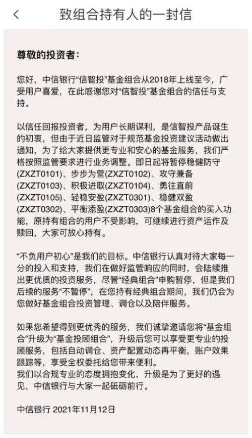 11月12日,中信銀行發佈《致組合持有人的一封信》,表示“由於近日監管對於規範基金投資建議活動做出通知,中信銀行將按照監管要求進行業務調整。因此暫停8款基金組合產品的買入功能,原持有組合的用户不受影響。”