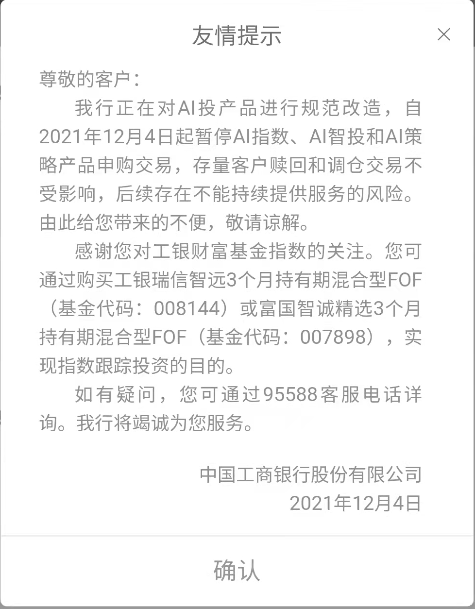 此外,工商銀行“AI投”提示顯示,該行對產品進行規範改造,暫停AI指數、AI智投和AI策略產品申購交易。提示信息中也表示,後續存在不能持續提供服務的風險。