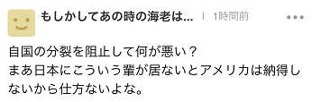此外,有人説,“(中國)阻止國家分裂有什麼問題嗎?不過沒有辦法,如果在日本沒有這種傢伙(安倍等極端右翼政客)存在的話,美國是不會同意的。”