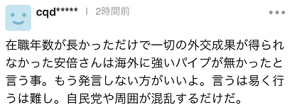 消息傳回日本,安倍晉三近期作秀成癮也讓部分日本網民厭煩。有人稱:“這個人説的話不能信”。“只會打嘴炮”。還有人評論稱:“安倍在職首相時間雖長,但沒有取得任何外交成果,這代表他在海外沒有有力渠道。安倍最好還是別説話了。言之非難,行之為難。(安倍發言)只會讓自民黨內部和安倍周邊人士混亂。”