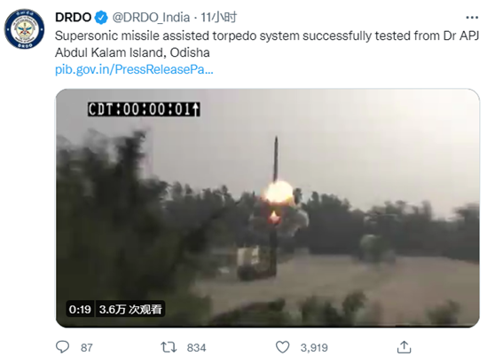 俄羅斯衞星通訊社12月13日報道稱,印度國防研究與發展組織(DRDO)發佈消息稱,印度當天在奧里薩邦沿海城市巴拉索爾成功試驗了“超音速導彈輔助魚雷發射系統”(SMART)。