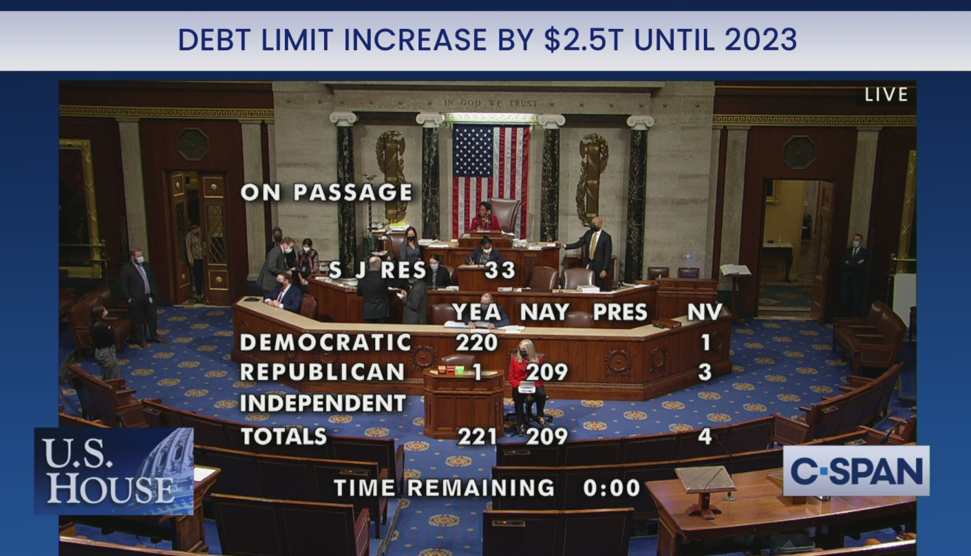 美國國會眾議院當地時間12月15日凌晨通過聯合決議案,將聯邦政府債務上限調高2.5萬億美元,使美國財政部的借款授權可延長至2023年,暫時避免政府債務違約。