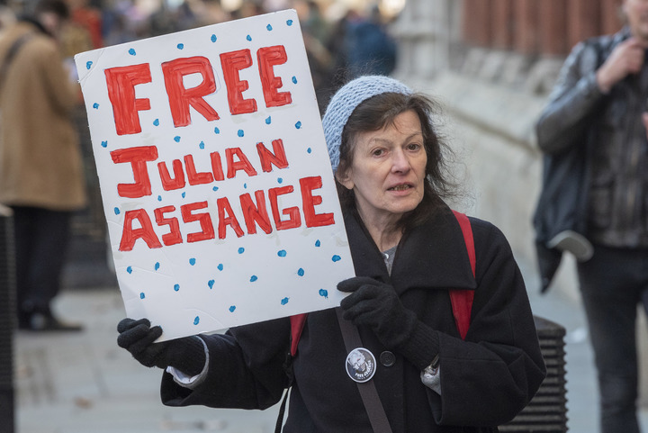 12月10日,在位於倫敦的英國高等法院外拍攝的阿桑奇支持者。(新華社發,雷伊·唐攝)