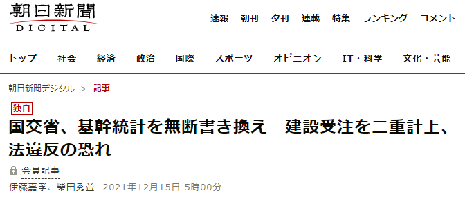 此外,對於沒來得及當月提交項目單的公司,國交省並不會在統計報告時將該公司當月接到的項目記為0,而是通過當月其他公司提交的項目單推算未提交的公司承接項目涉及資金規模。報道稱,這導致國交省在統計時重複記賬一部分工程項目涉及的資金。報道還稱,多名國交省相關人士透露,從2013年實施該統計方法開始,截至今年4月更正統計方法,地方政府每年會按照國交省要求修改約1萬份資料。報道稱,2020年度“建設工程項目動態統計”記賬工程項目資金規模共計76兆5988億日元,被用於計算該年度GDP,國交省官員承認“理論上GDP可能被高估”。報道稱,國交省涉嫌違反日本統計法。