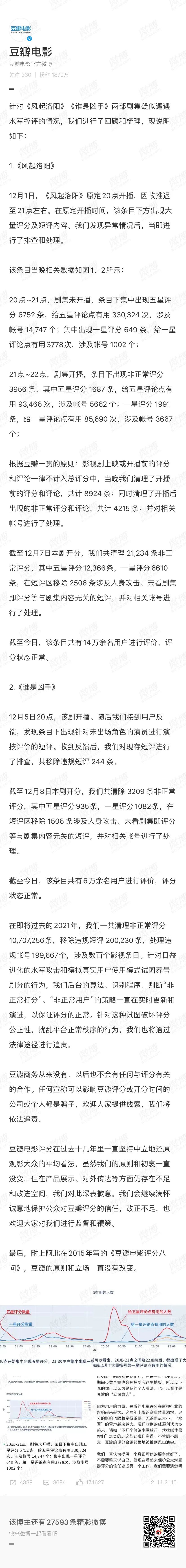 日前,央視發佈題為《影視劇遭遇“超前點評” “水軍”控評擾亂市場》的報道,指出兩部影視劇接連出現“超前點評”的荒誕一幕。12月14日,豆瓣電影官方賬號在社交平台上針對《風起洛陽》《誰是兇手》兩部劇集疑似遭遇水軍控評的情況進行了回應。 全文如下: