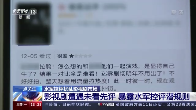 無獨有偶,在12月5日首播的某部懸疑網劇中,女主演尚未登場的前兩集播出後,網絡社交平台上同樣準時湧現了大量質疑其演技、台詞的論調和一星短評。兩部影視劇出現的“超前點評”現象被網友和媒體質疑為“水軍”刷分控評。
