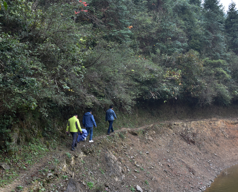 2021年11月21日,我館利濟巷分館工作人員跟隨李淑珍的小兒子前往江家洞進行實地考察,一行人沿着蜿蜒曲折的山路,來到當年日軍關押李淑珍等當地女性的房子。老人口中原先的茅屋已經坍塌,但當時用石頭壘造的地基仍存,如今的地基四周長滿了荒草與雜樹。