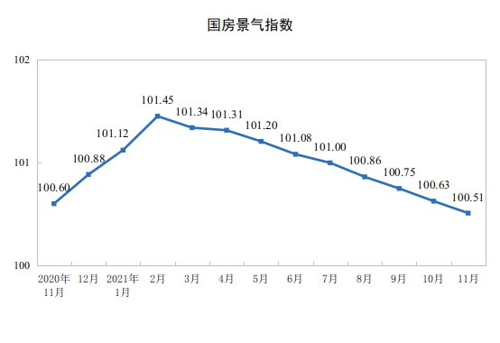 11月份,房地產開發景氣指數(簡稱“國房景氣指數”)為100.51。