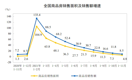 1—11月份,商品房銷售面積158131萬平方米,同比增長4.8%;比2019年1—11月份增長6.2%,兩年平均增長3.1%。其中,住宅銷售面積增長4.4%,辦公樓銷售面積增長2.0%,商業營業用房銷售面積下降2.6%。商品房銷售額161667億元,增長8.5%;比2019年1—11月份增長16.3%,兩年平均增長7.8%。其中,住宅銷售額增長9.3%,辦公樓銷售額下降3.0%,商業營業用房銷售額下降2.2%。