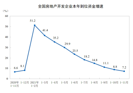 1—11月份,房地產開發企業到位資金183362億元,同比增長7.2%;比2019年1—11月份增長14.2%,兩年平均增長6.9%。其中,國內貸款21640億元,下降10.8%;利用外資90億元,下降41.7%;自籌資金59378億元,增長4.8%;定金及預收款67156億元,增長17.0%;個人按揭貸款29633億元,增長9.8%。