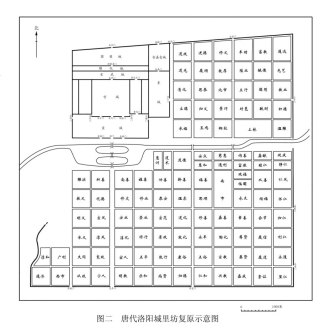 郭城以洛河為界,分南北兩部分,洛河以南稱洛南里坊區,洛河以北稱洛北里坊區,為百官府第和百姓居住地。城內街道縱橫,裏坊毗鄰。隋唐時期為便於管理,官府在都城內每500平方米規劃一個居民區,稱為裏坊。裏坊東西南北各廣三百步,內有十字街,四面坊牆居中開門,坊內十字街,各坊之間以街道相隔,每坊建有圍牆,留有坊門,晝開夜關。文獻記載,唐代 103 坊,其中洛北 29 坊,洛南 74 坊。