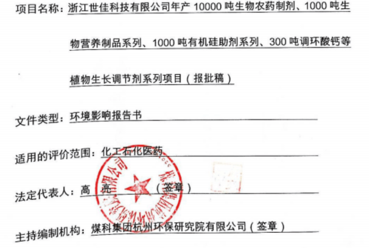 但是根據煤科集團杭州環保研究院有限公司在2017年12月出具的《浙江世佳科技股份有限公司年產10000噸生物農藥製劑、1000噸生物營養製品系列、1000噸有機硅助劑系列、300噸調環酸鈣等植物生長調節劑系列項目》(國環評證乙字第2015號),其中關於生物農藥製劑公示的產能,與公司本次發佈招股書披露的募投項目產能並不一致。