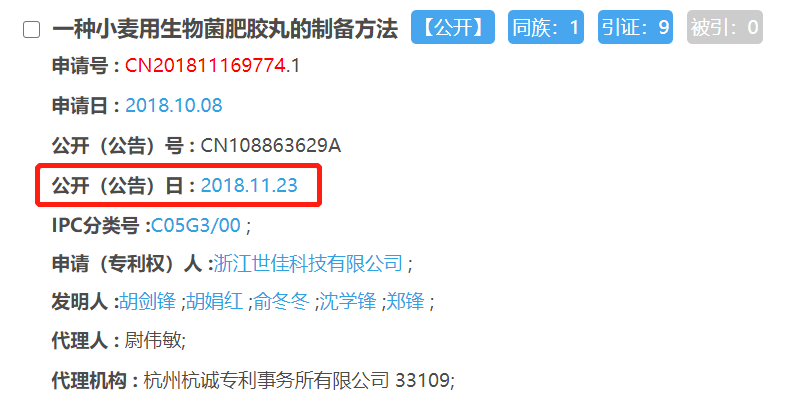 在新增的五項發明專利中,就包括“一種小麥用生物菌肥膠丸的製備方法”,但是據國家知識產權局檢索顯示,此項專利的公開日早在2018年11月,顯著早於世佳科技第一版招股書的披露日。至於當時此項專利為什麼沒有在招股書中進行披露,以及保薦機構國金證券在核查過程中,是否遺漏了重要專利信息,世佳科技並未接受記者採訪。