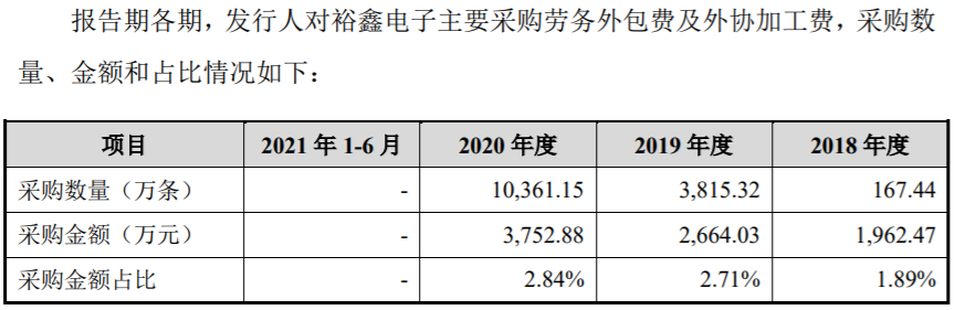 根據招股書披露,“沂南縣環越電子有限公司”是泓淋電力最主要的外協加工廠商之一,2021年上半年採購數量達5343.27萬條、採購金額為2499.79萬元,這家公司系由裕鑫電子實際控制人設立,因承接裕鑫電子業務於2020年12月與發行人建立合作,在此之前裕鑫電子則是泓淋電力最主要的外協加工廠商。