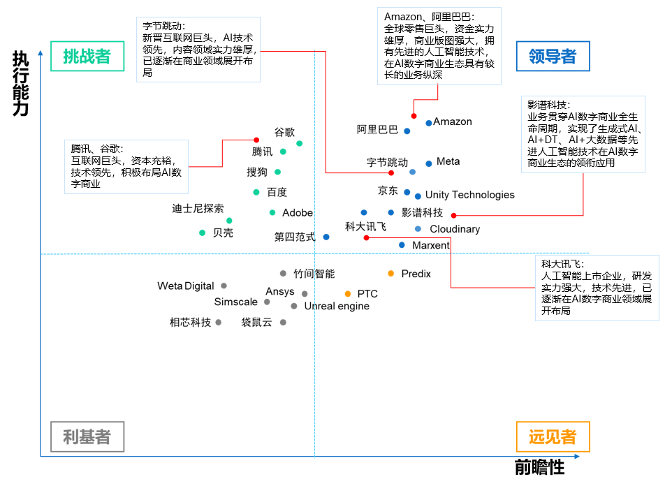 報告分析,我國在AI數字商業生態市場位於領先地位的企業主要是領先的AI數字商業解決方案提供商和參與AI數字商業生態的商業巨頭,前者以影譜科技為代表,其業務領域廣泛,貫穿了AI數字商業內容和AI數字服務的全生命週期,技術成熟度領先,實現了生成式AI、AI+DT、AI+大數據等先進人工智能技術的領銜應用,後者以阿里巴巴為代表,其資金實力雄厚,商業版圖強大,擁有先進的人工智能技術,且在AI數字商業生態中具有較長的業務縱深,在AI數字商業內容、AI數字服務、AI數字運營等板塊均有佈局。