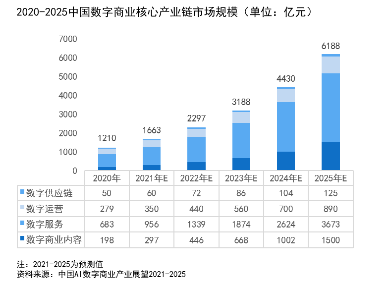 報告預測,2021年我國數字商業核心產業鏈市場規模將達1663億元,預計2025年將達6188億元,年均增速38.6%。數字商業正成為繼互聯網零售之後,商業生態的重要形態和力量。