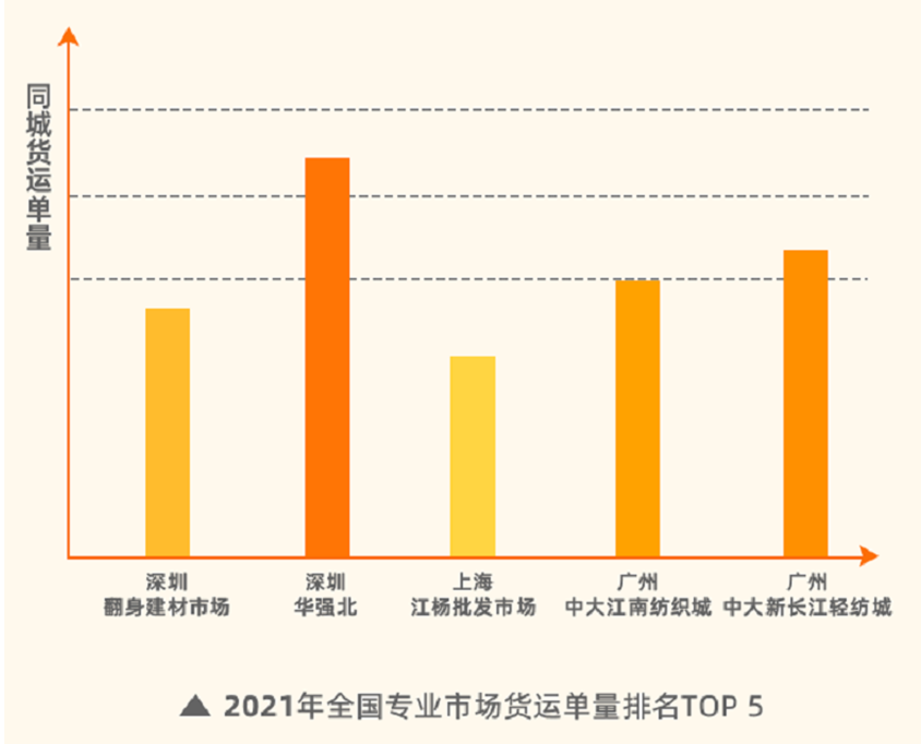 2019-2021年,華強北在全國專業市場同城貨運單量排名裏蟬聯第一,廣州中大新長江輕紡城則穩居第二。其中,廣州重大江南紡織城、深圳翻身建材市場也連續3年進入排名前5名,貨運量穩定。