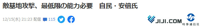 據時事通訊社報道,安倍晉三還聲稱,日本“難道不應該探討擁有最低限度的攻擊能力嗎?”看來,安倍認為,讓日本的年輕人跟隨美軍投入戰鬥是“最低限度的攻擊能力”。日本政府致力於解釋所謂“對敵基地攻擊能力”系抑制力,似乎在安倍晉三這個日本極端右翼政客領頭人物眼中,這是讓自衞隊跟隨美軍作戰的能力。