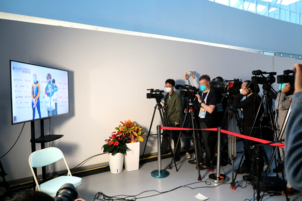 根據疫情防控要求,本次系列測試賽和測試活動的賽後採訪均採用“遠程採訪”方式,記者們通過大屏幕與運動員進行視頻連線。