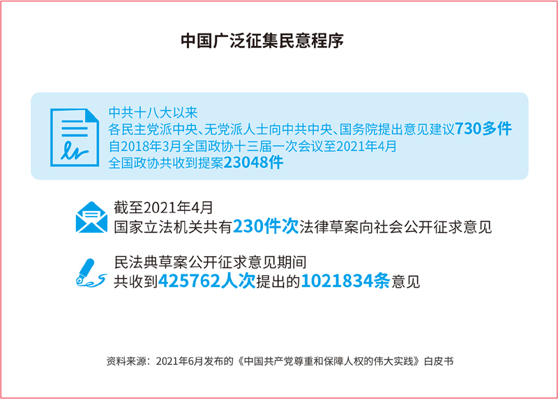 “立法直通車”。 全國人大常委會法工委近年設立了“基層立法聯繫點”,使百姓意見抵達國家最高立法機關有了“直通車”。到2021年10月,全國22個基層立法聯繫點共為126部法律草案、年度立法計劃等提供7800餘條意見建議,其中2200餘條意見建議被不同程度吸收採納,使立法更加精細化。