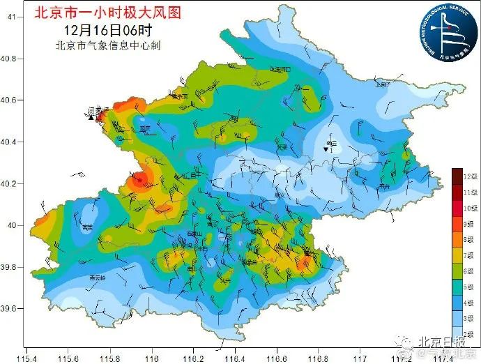 今天一早,北風就開始呼嘯了。大概5時,北京西部沿山一帶及城區大部分地區已經颳起了明顯的北風,陣風六七級。 6時,南郊觀象台的氣温雖然已經上升到了5.1℃,氣温並不算太低,但由於北風較大,風寒效應顯著, 體感上要比實際温度低很多。