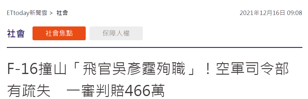 台軍飛行員開F-16撞山身亡,台媒:“空軍司令部”被判賠466萬新台幣