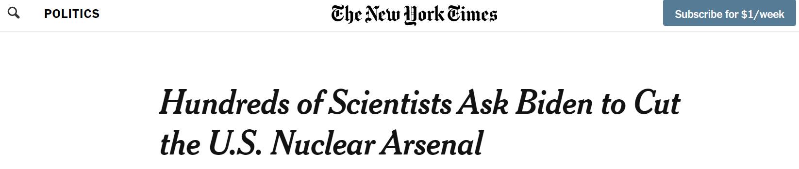 據《紐約時報》報道,包括21名諾貝爾獎獲得者在內的近700 名科學家和工程師16日致信拜登,要求其利用即將發佈關於管理核武器的新國家戰略的機會,把美國核武庫削減1/3,並宣佈美國永遠不會在衝突中首先使用核武器。