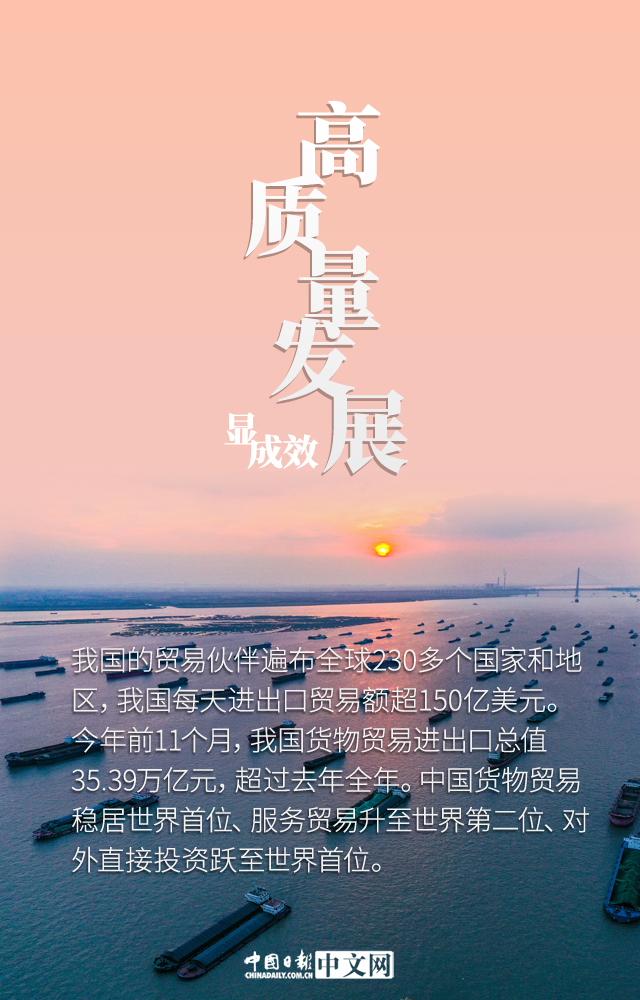 今年以來,外貿對中國經濟和世界經濟的貢獻日益凸顯,有力地帶動經濟增長,穩崗就業作用突出,滿足人民多樣化需求,推動全球經貿復甦。1-11月份,中國進出口總值35.39萬億元人民幣,同比增長22%,比2019年同期增長24%。外貿進出口總值已超過去年全年規模。中國持續推進高水平對外開放,以開放促改革、促發展成效不斷顯現,外貿量穩質升的基礎持續鞏固。
