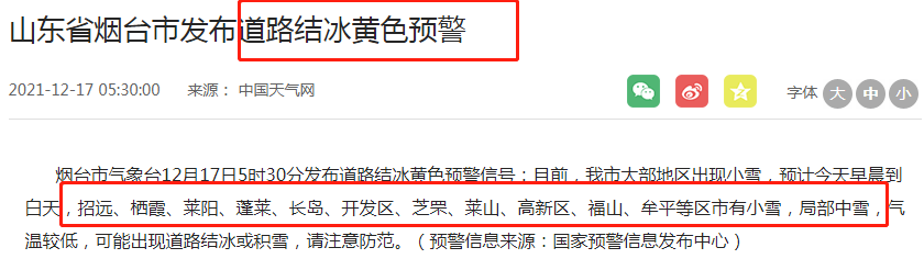 受強冷空氣影響,目前威海蔄山、汪疃等鄉鎮已出現8毫米以上的強降雪,積雪深度超過10釐米 ,預計今天白天市區、文登北部、榮成大部仍有中到大雪,局部暴雪,道路結冰和積雪將比較嚴重。