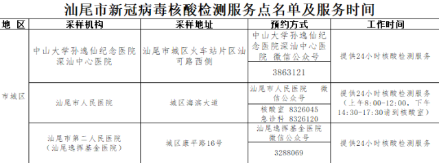 汕尾市核酸採樣檢測的醫療機構公佈如下: