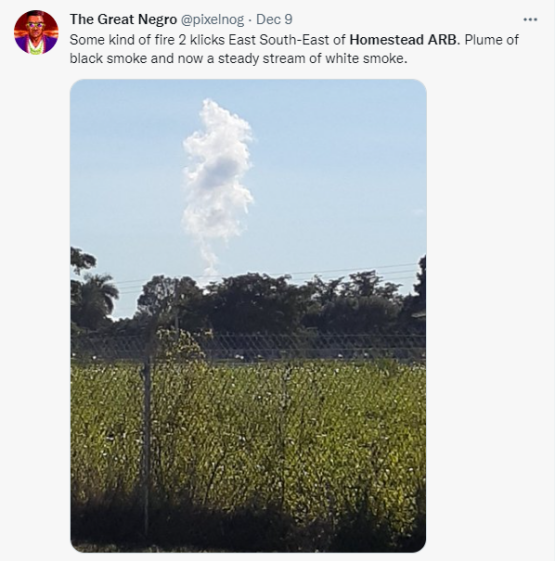 在這次事故發生前不久,有網友12月9日在推特上發文稱,美國霍姆斯特德空軍後備基地東南部發生兩次某種“起火”,可以看到一縷黑煙升起,然後變成源源不斷的白煙。